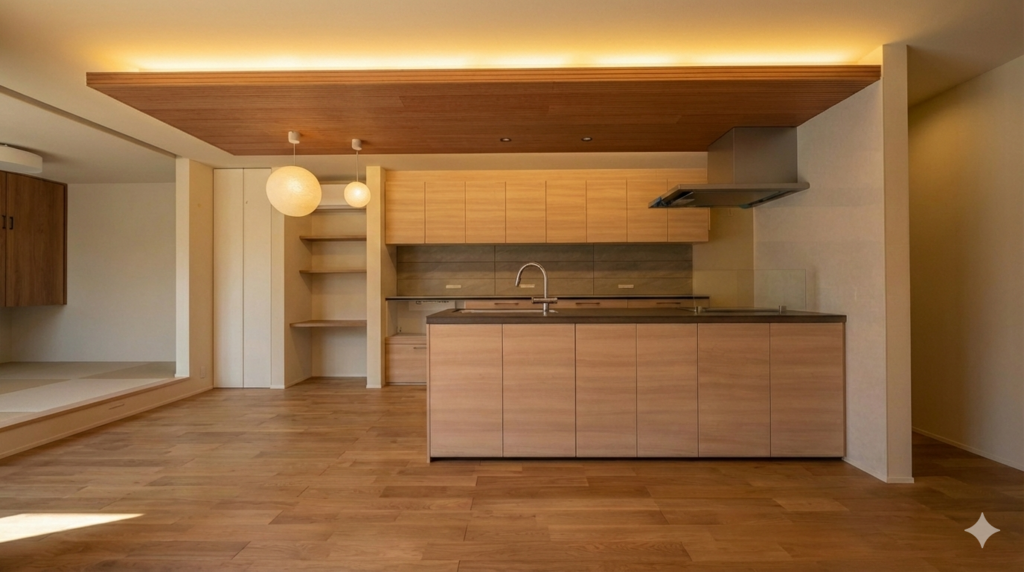 24帖ゆったりLDKに畳コーナーを設けて中庭(タイルデッキ)と一体感ある利用ができます プライベートもきちんと確保しています