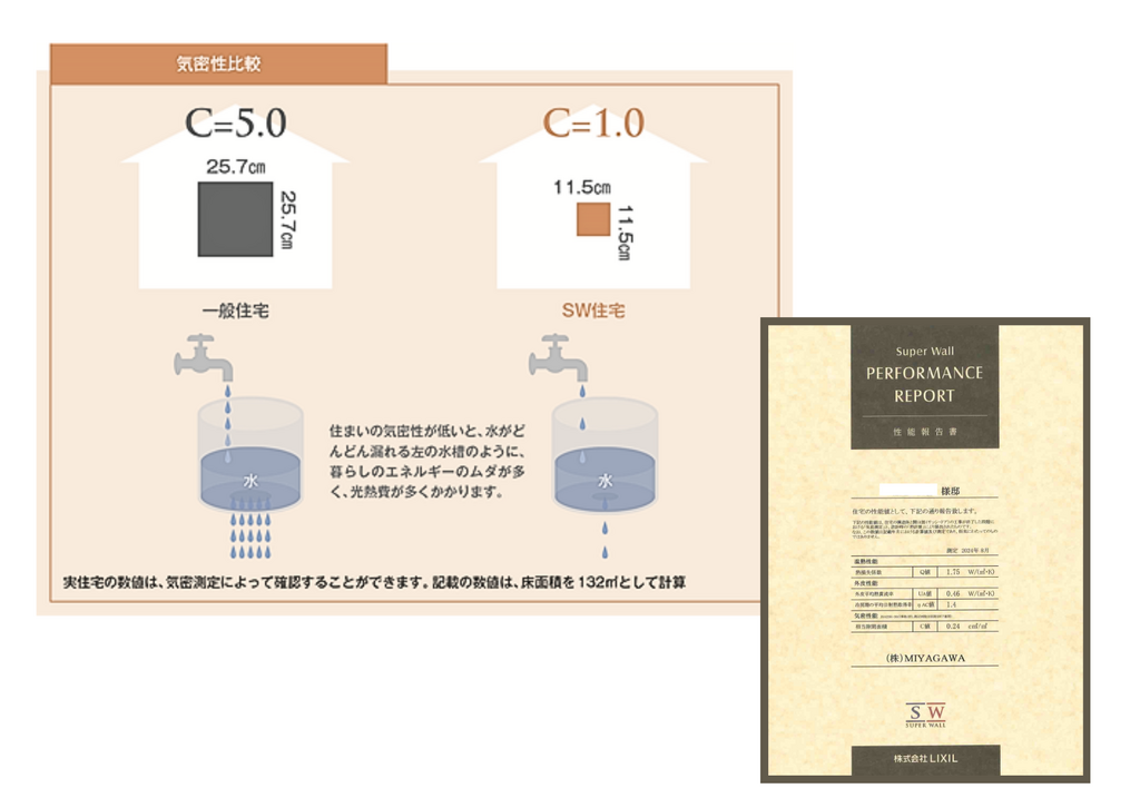 C値が低ければ低いほど隙間が少なく、一般的な住宅のC値が5.0(25.7㎝角)に対し、SW工法の基準がC値 1.0 (11.5㎝角)、更にMIYAGAWAの基準はC値 0.5 (8.77㎝角) 以下と、厳しい基準を設けています。