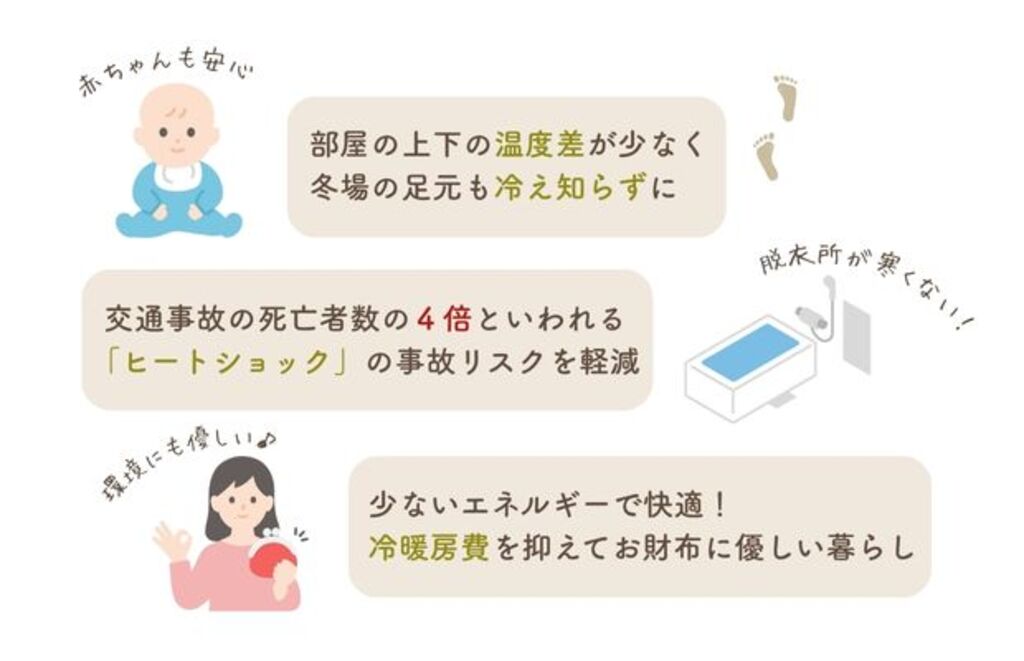 部屋間の温度差が少なくなり、冬場のヒートショックのリスクを低減。入浴時の脱衣室やトイレで「ぶるっと震える」といった寒さも解消されます。