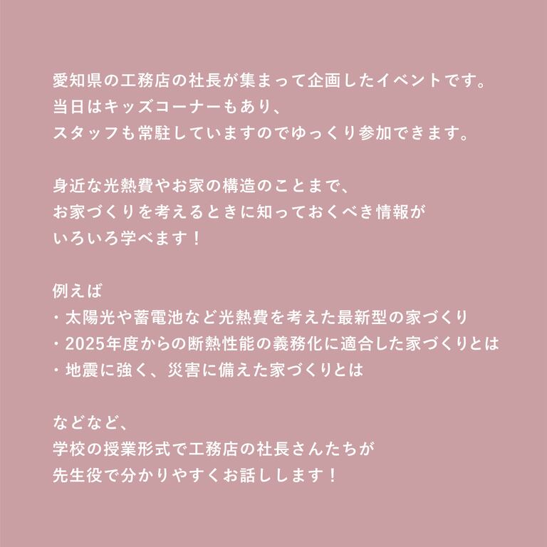 愛知県の工務店の社長が集まって企画したイベントを開催します。