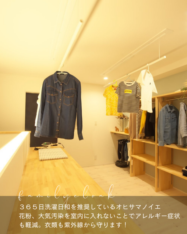 ランドリールームの見どころ 365日洗濯日和。2階の家族の動線上にランドリールームを配置したことでママの家事ラクが叶いました。枚方で31年注文住宅×リフォーム店