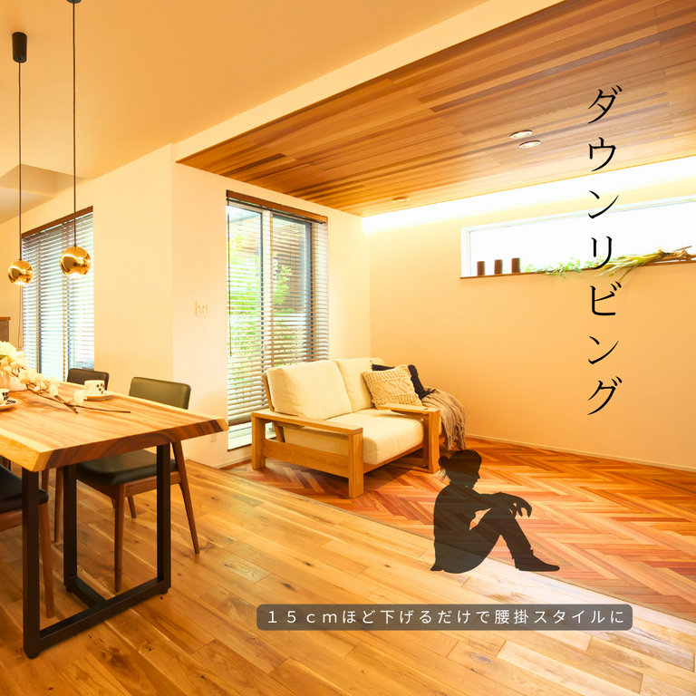 リビングの見どころ たった8帖スペースでくつろげたり、人が集まるときはダウンフロアが椅子代わりになることなど工夫しているところをチェック