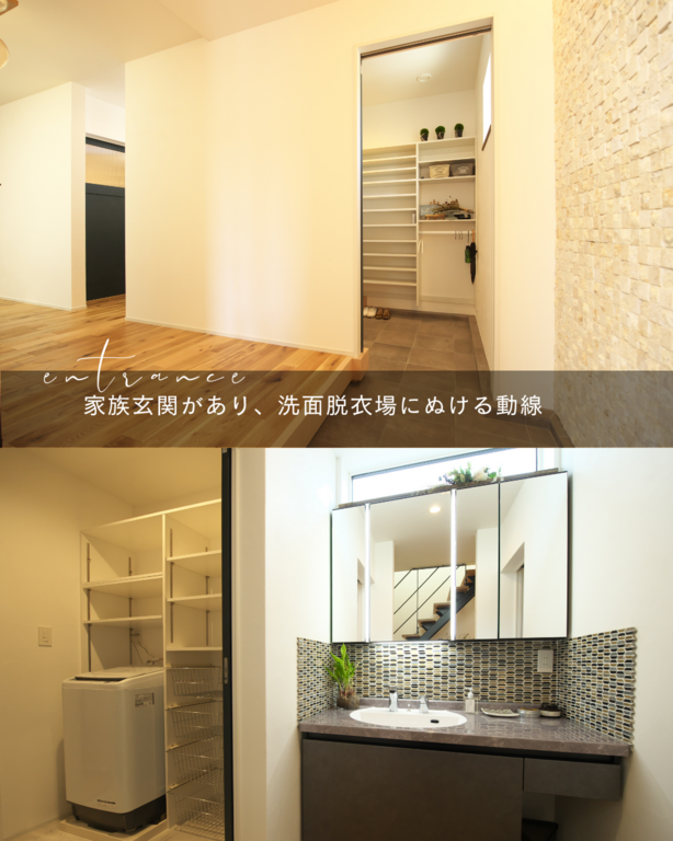 洗面所の見どころ、家族玄関からのながれで手洗い→脱衣場→お風呂場の動線