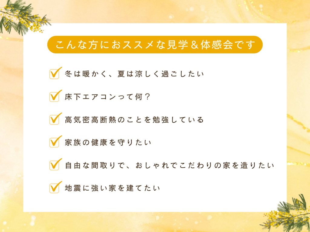 | タイトル | 【堺市】1/11(日)~ 床下エアコン1台で30坪が素足でも暖かい。高性能住宅あったか体感&見学会 |