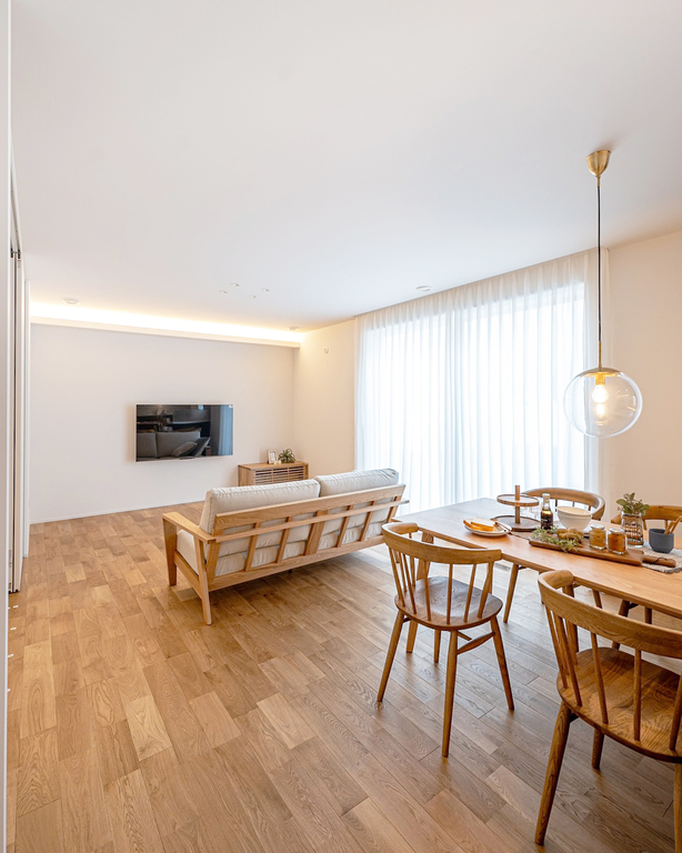 床は優しい無垢。見た目の美しさと耐久性を兼ね備えたオーク材。