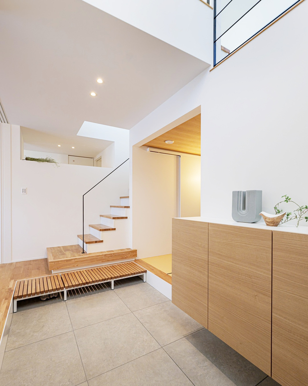 玄関を入ると、広い土間がお目見え。お家の中と外を優しく繋ぐ。上部が吹き抜けなので広々とした空間を演出。