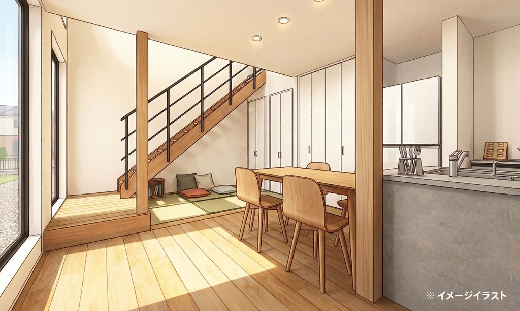 自然の力を活かすパッシブ設計で、一年中快適な22帖の大空間LDK。冬は暖かく夏は涼しい深い軒と大開口、家事ラクを極めた最短動線、そして階段下の落ち着く畳コーナー。家族のゆとりを追求した工夫が詰まった、数字以上の広がりを感じる住まいを、ぜひ内覧会でご体感ください。