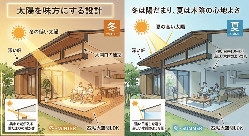 緻密に計算された「深い軒」と「大開口の連窓」が、この家の快適さを支える大黒柱です。冬は低い位置にある太陽の光を部屋の奥まで招き入れて「天然の暖房」に。逆に夏は、高い位置から降り注ぐ厳しい日差しを軒が物理的に遮り、室温の上昇を抑えます。