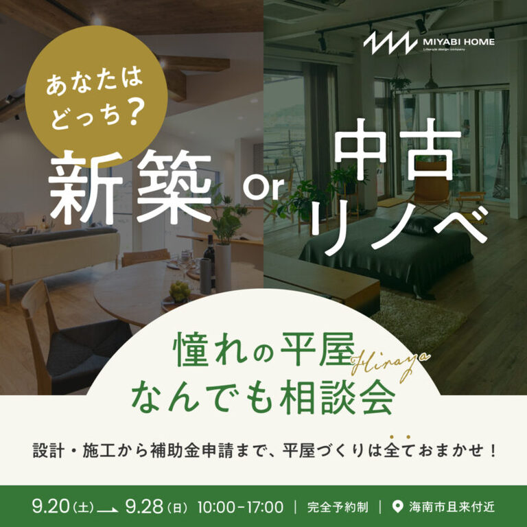 | タイトル | 憧れの平屋ライフ!新築?中古リノベ?あなたはどっち?平屋何でも相談会 |