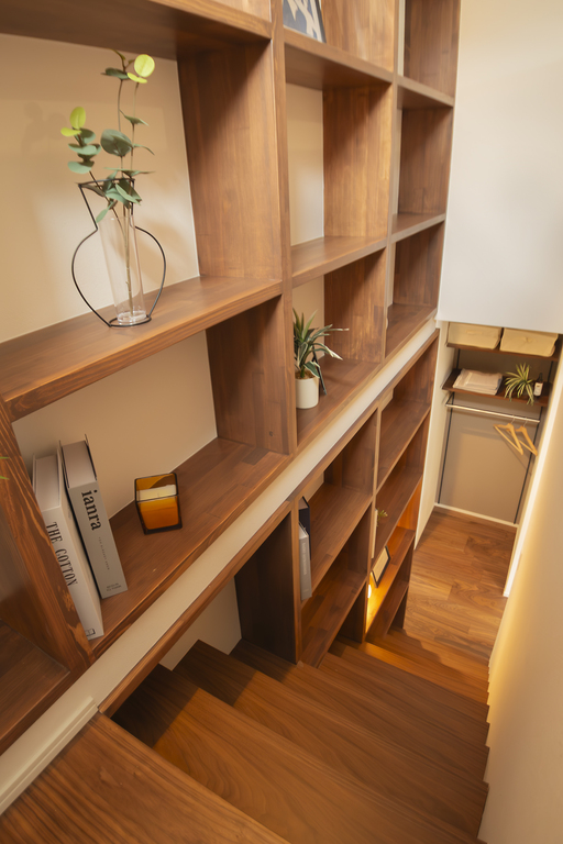 階段脇のスペースを活かした造作収納は、