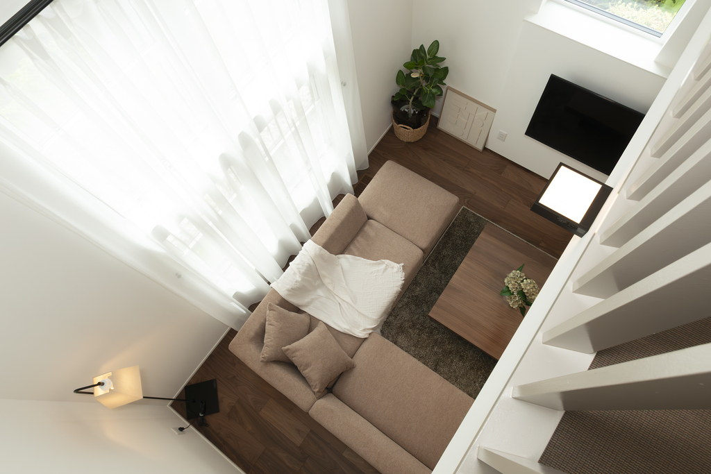 勾配屋根の形状を活かした吹き抜けリビング