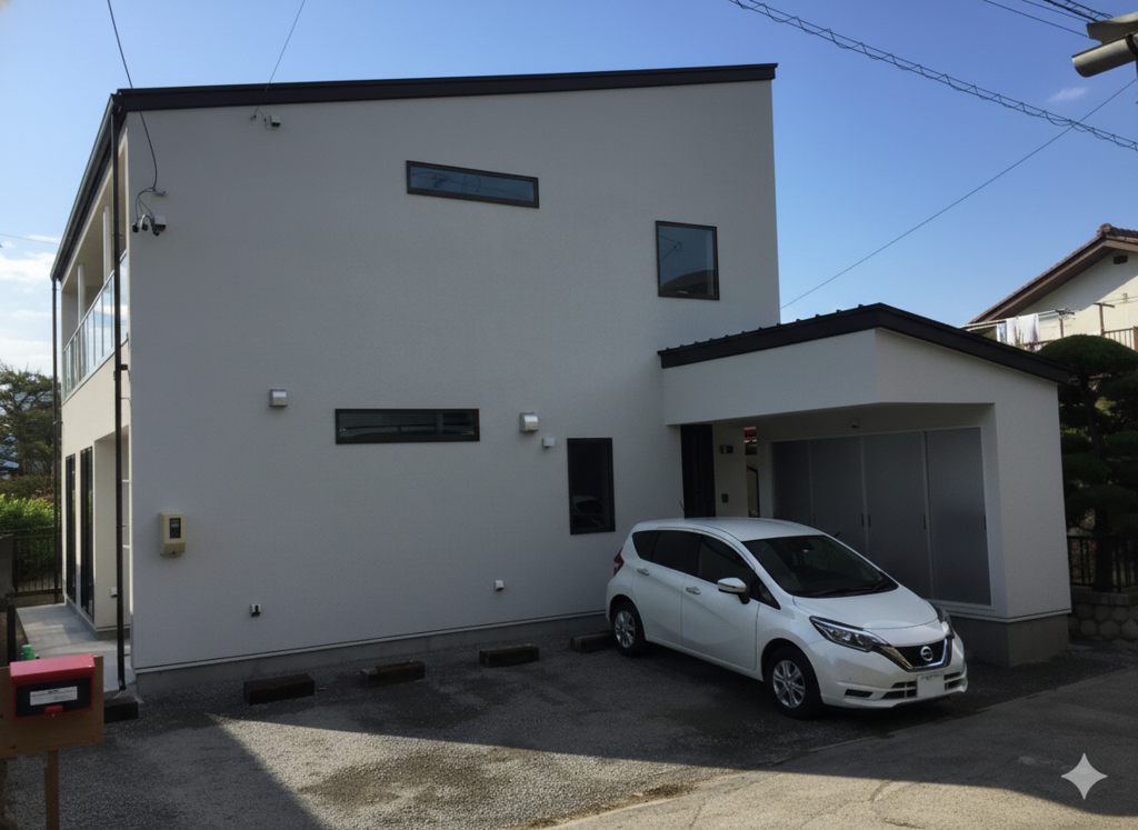 雨に濡れないための車寄せにより玄関までの導線をつくりました。