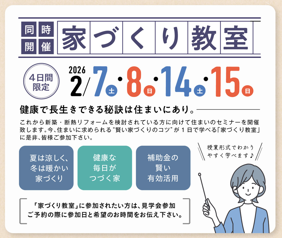 今住まいに求められている“賢い家づくりのコツ”が1日で学べる「家づくり教室」に是非、皆さまご参加下さい。