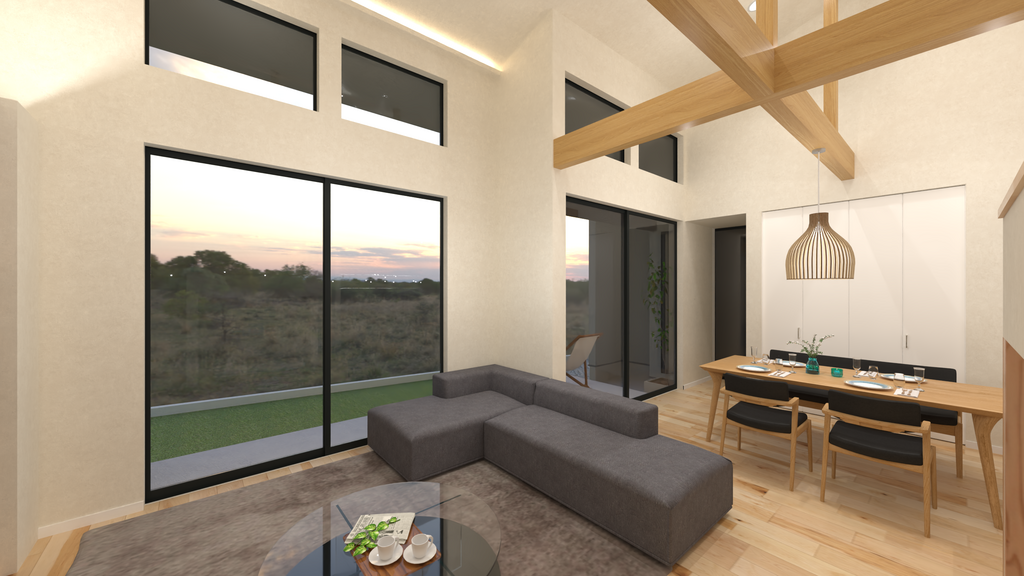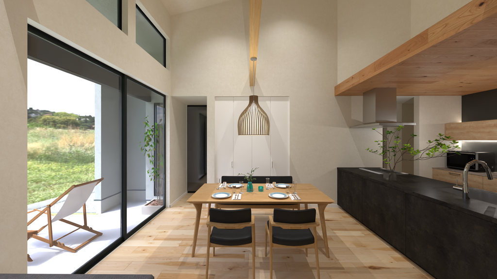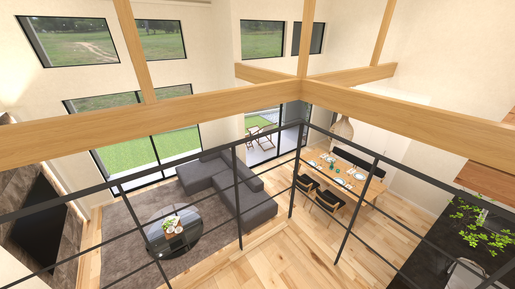 このお家のリビングエリアは吹き抜け空間になっており、驚くほど明るく開放的です。大きな窓から差し込む自然光は、家族団らんの時間を彩ります。オープンキッチンと一体化し、リビング全体が一つの大きな空間として機能します。吹き抜けの効果で空間が広がり、家族とのコミュニケーションがより一層深まります。