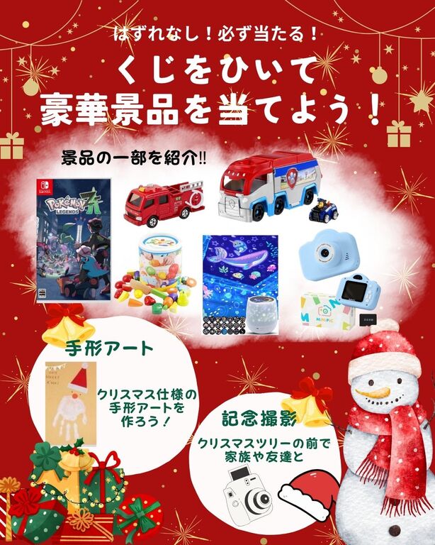 はずれなしの豪華くじ引きだけでなく、クリスマス仕様の「手形アート」を作成できるブースやクリスマスツリーの前での記念撮影ブースもご用意しています!