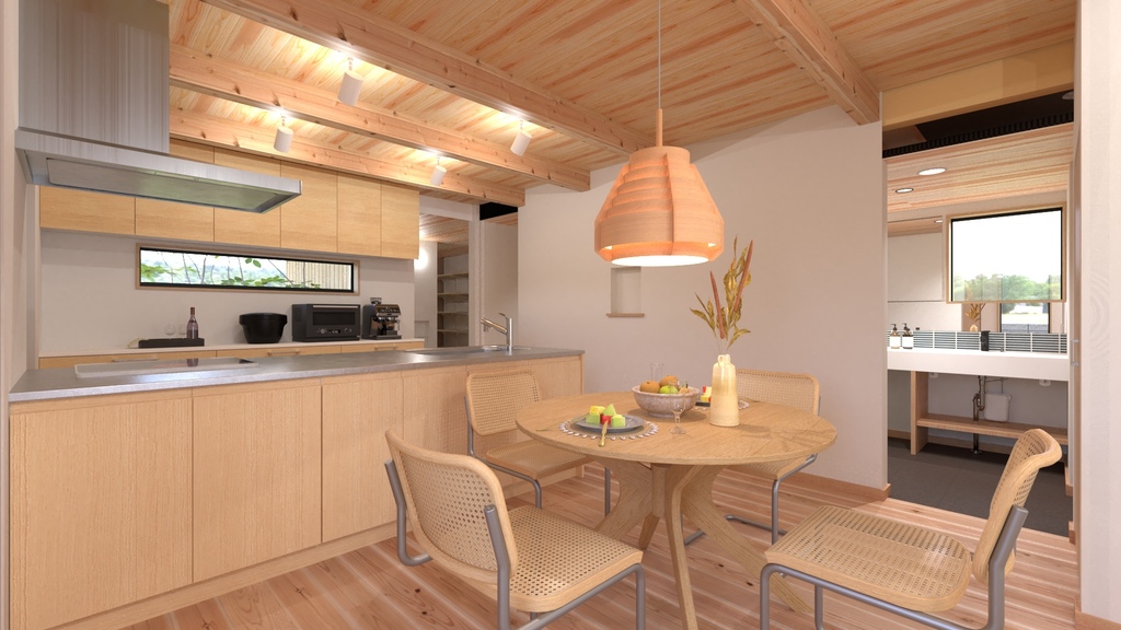 こちらのお家の床材、天井材には「Jパネル」と言われる天然無垢材の木材を使用しています。無垢材の良さを残したまま、調湿にも優れている建材となっています。