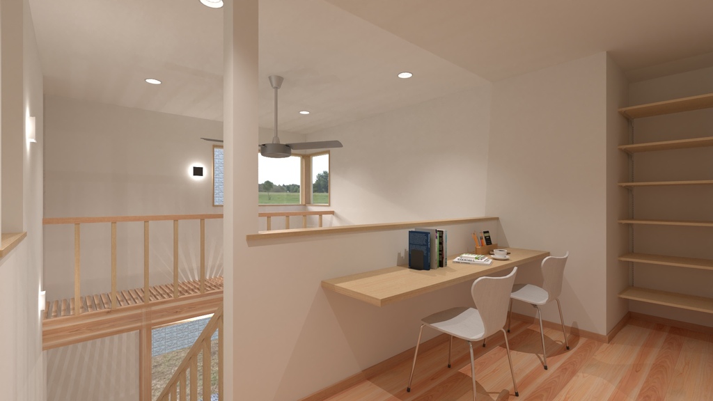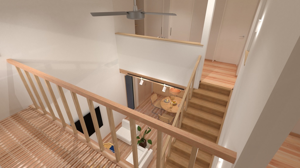 吹き抜け空間の上には廊下を設置し、どこにいても家族を感じることができます。