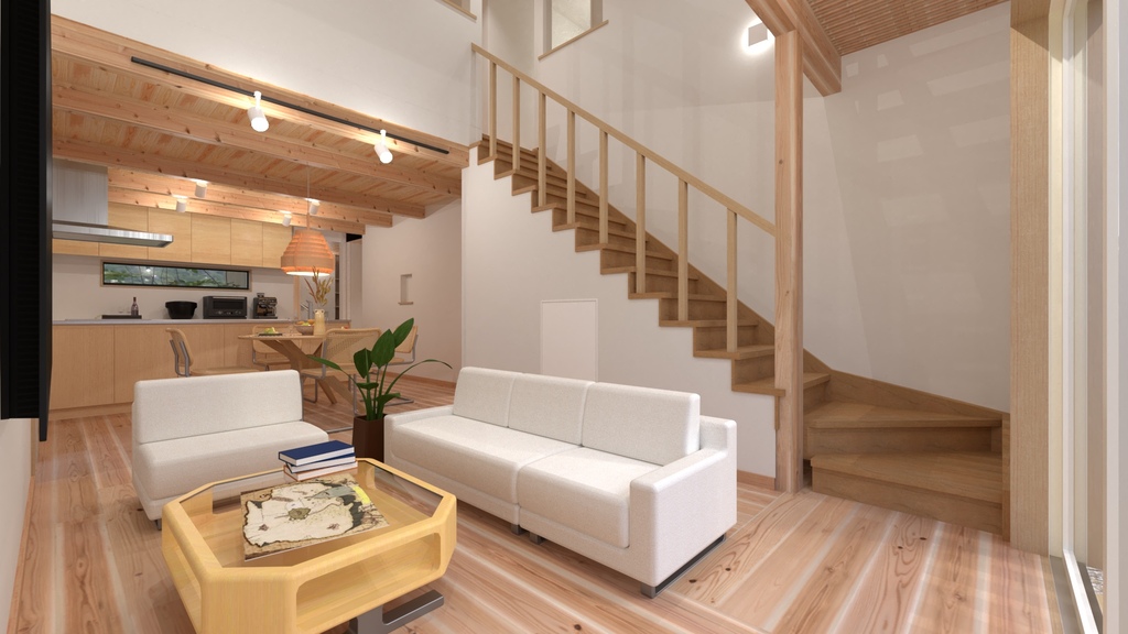 家族が自然と集まる、ゆとりのあるリビング空間。視線の抜けを意識した設計で、実際の広さ以上に開放感を感じられます。