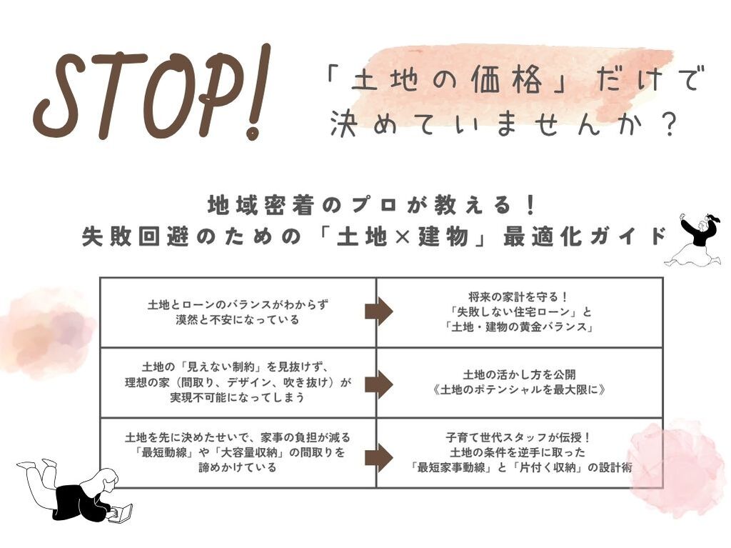 家づくりで最も重要な「資金計画」と「土地選び」をセットで学べるため、効率的かつ失敗のない成功への最短ルートを提示できるからです