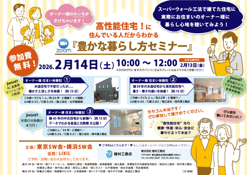 【2月14日(土)ZOOM開催】高性能住宅のホンネが聞ける「豊かな暮らし方セミナー」