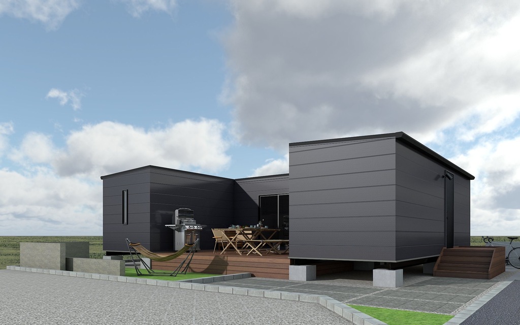 トラックで運べるコンテナを3棟つなげたモデルハウスは、ミニマムで無駄のない、新しい住まいのかたち。
