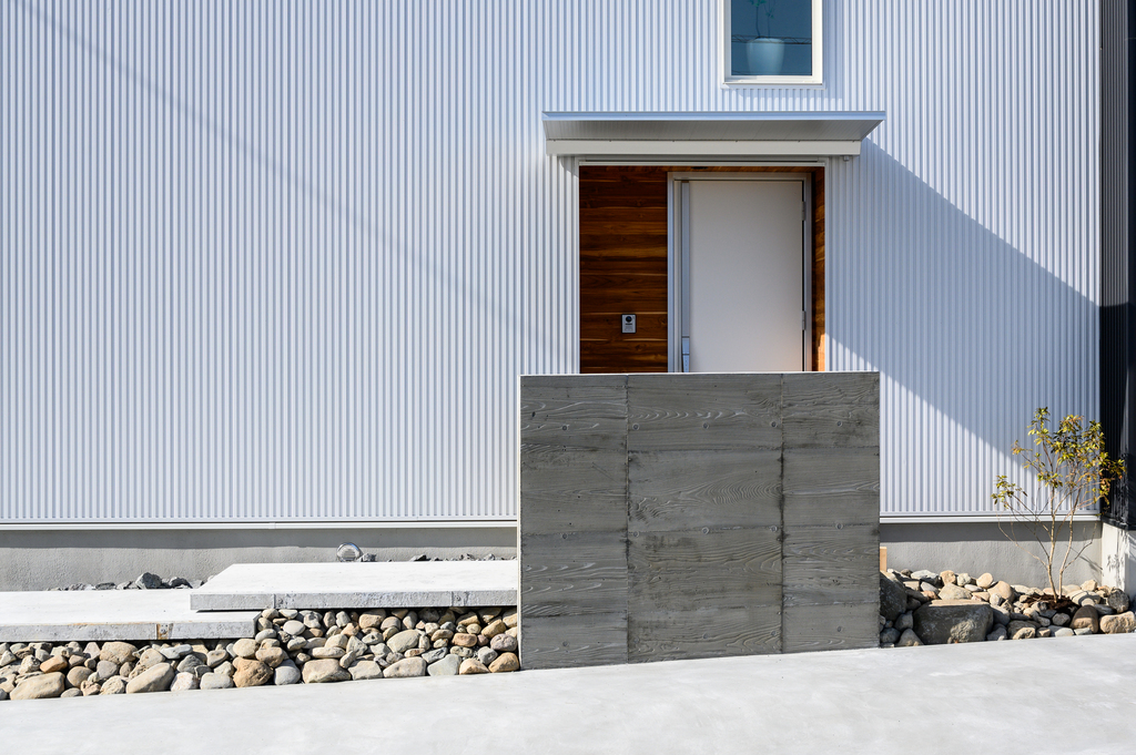 ガルバリウム鋼板と塗り壁の外壁、無垢床、造作家具。