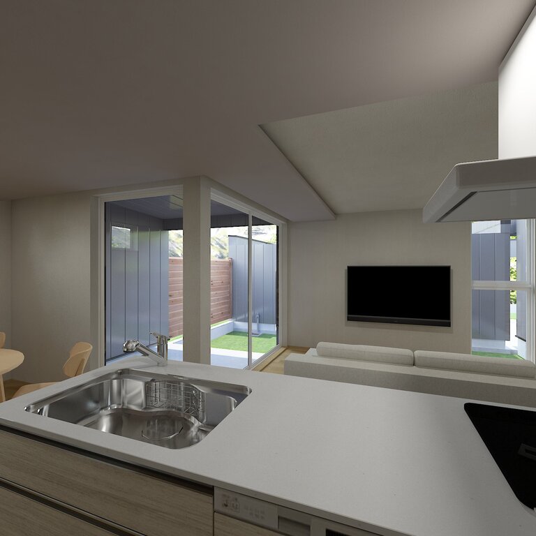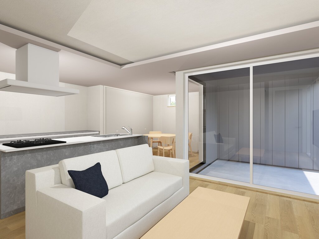 リビングから視線がそのまま外へと抜け、コートハウスならではの落ち着いた外部空間が広がります。