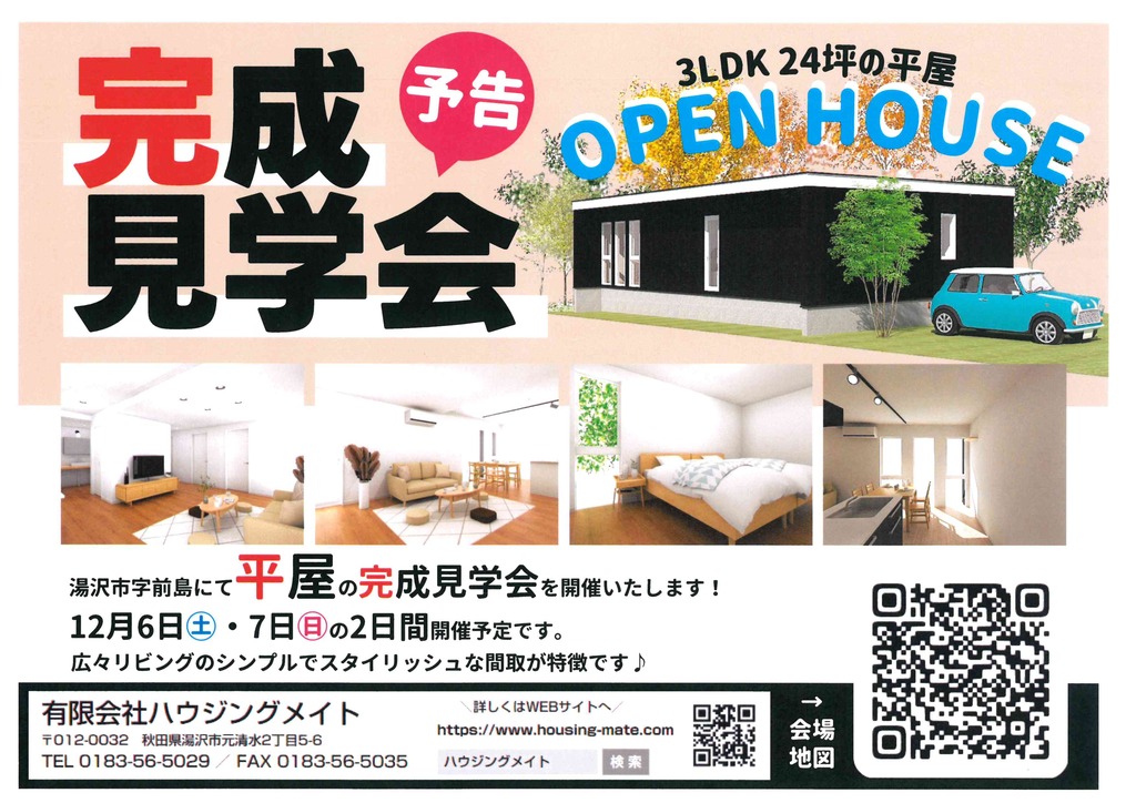 湯沢市前島にて平屋の完成見学会を開催いたします!