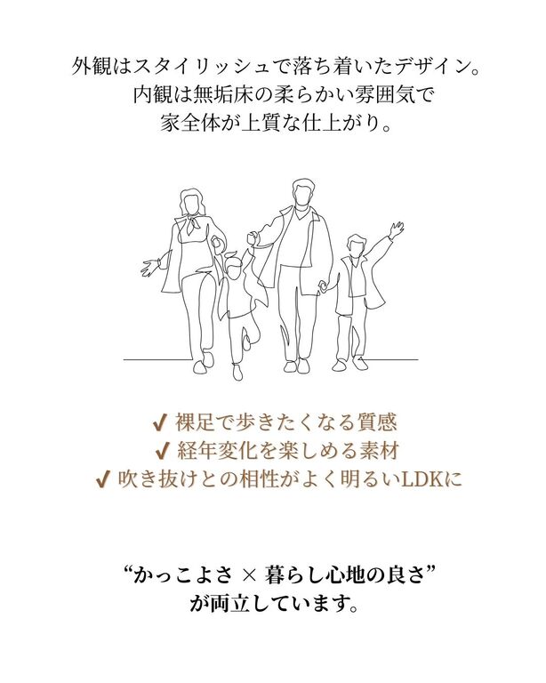 無垢床のやさしさ × モダンなかっこよさ 外観は落ち着いたブラウン・ブラック基調のかっこいいデザイン。 内観は無垢床のぬくもりと柔らかい光。