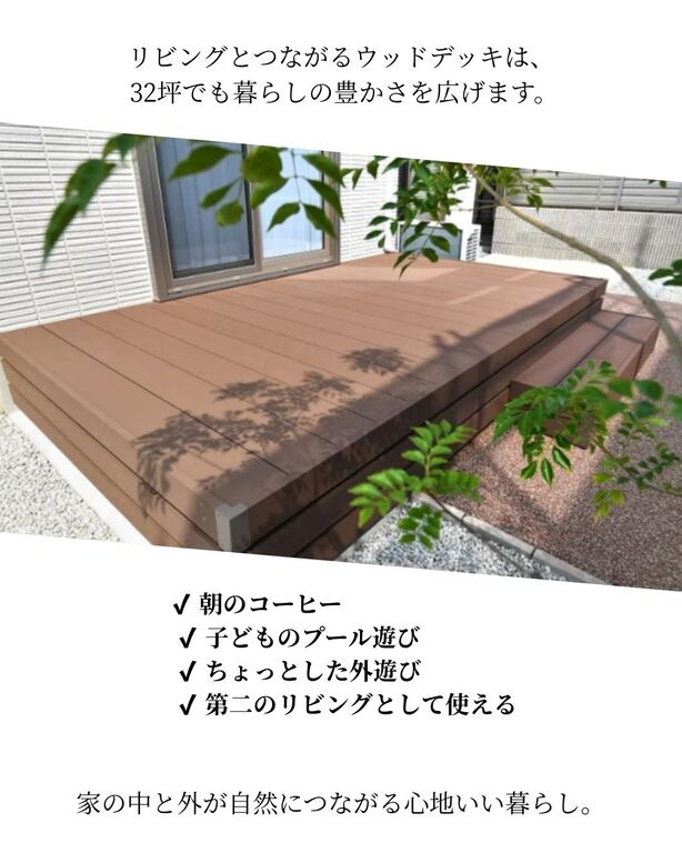 ウッドデッキがつくる“余白の時間” リビングとつながるウッドデッキは、32坪で 暮らしの豊かさを広げます