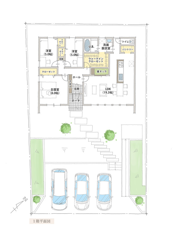 また、3~4台停められる広々駐車スペースがあり、来客時もスムーズ!