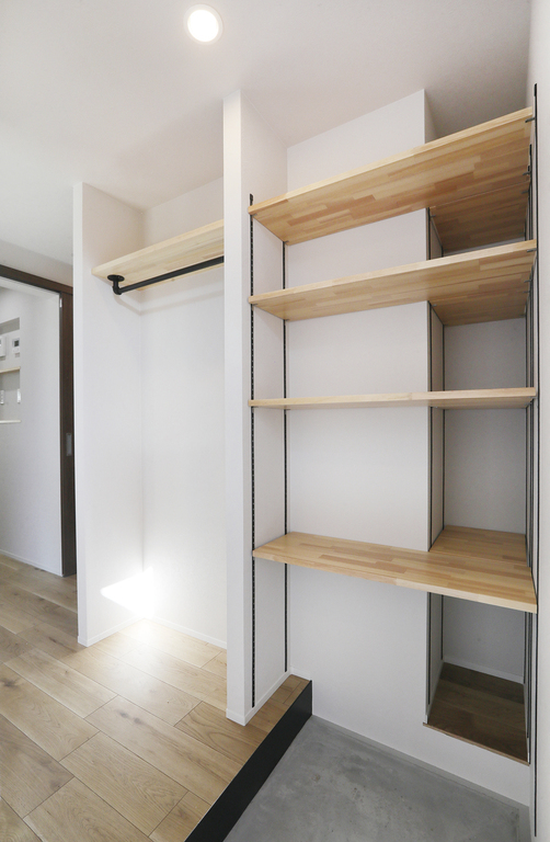 玄関にはコート掛けと大容量シューズクロークを配置することで、靴や外で使用するものをすっきりと収納でき、玄関周りの動線を最適化しています。