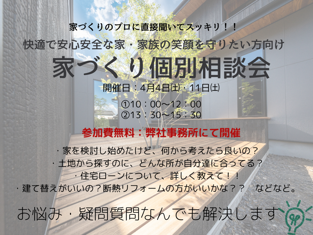 | タイトル | 疑問解決します♪大切な家族と共に 家づくり個別相談会 |