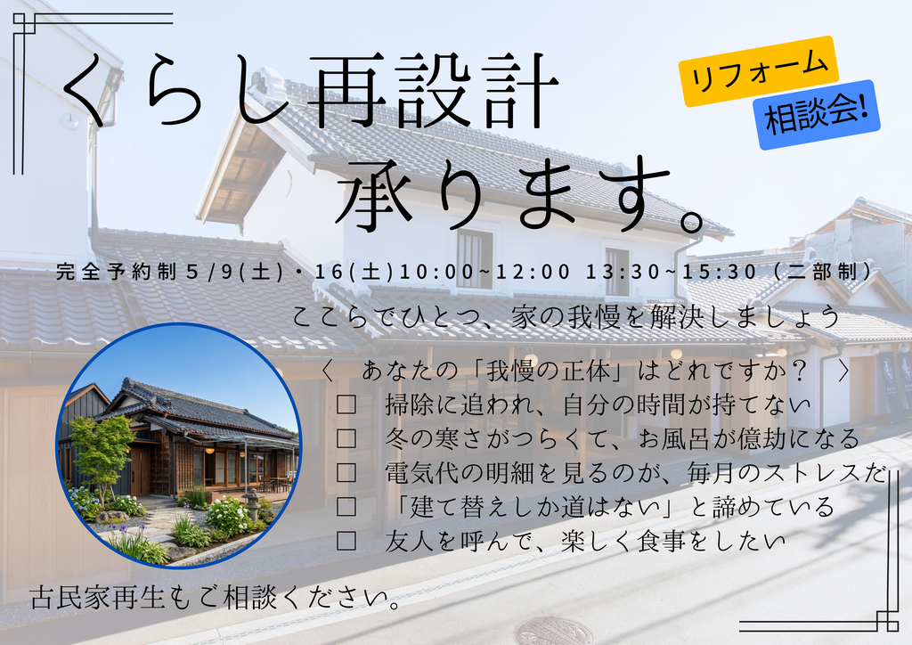 5/9(土)・5/16(土)に、完全予約制のリフォーム相談会を開催します。