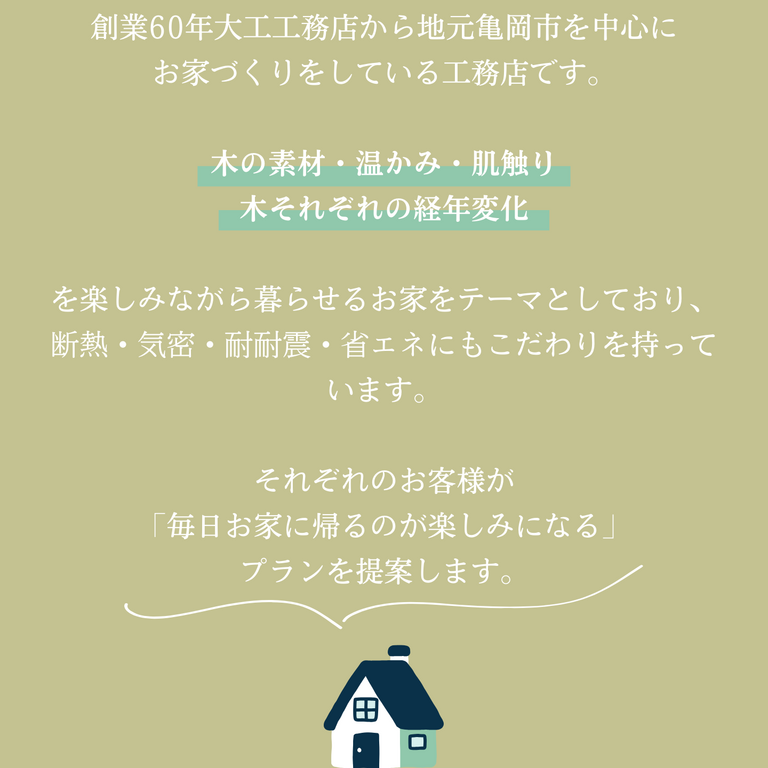 、世界にひとつだけのお家をお施主様に寄り添いながら家づくりさせていただきます。