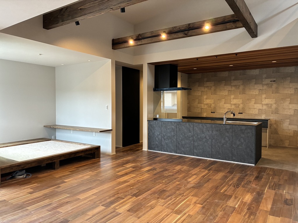 無垢の床材の温もりに、存在感のある化粧梁、そしてくつろぎの小上がり和室を組み合わせたインダストリアルモダンな空間。デザイン性と居心地の良さを兼ね備え、家族が自然と集まる心地よいリビングを実現しました。