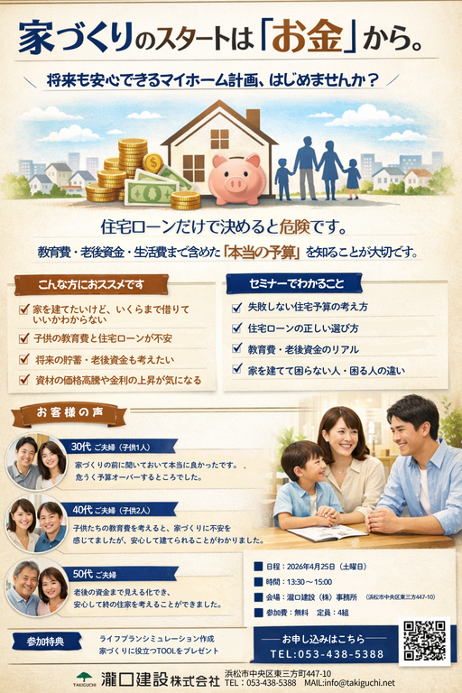 | タイトル | 家づくりのスタートは「お金」から 資金計画!ライフプランセミナー |