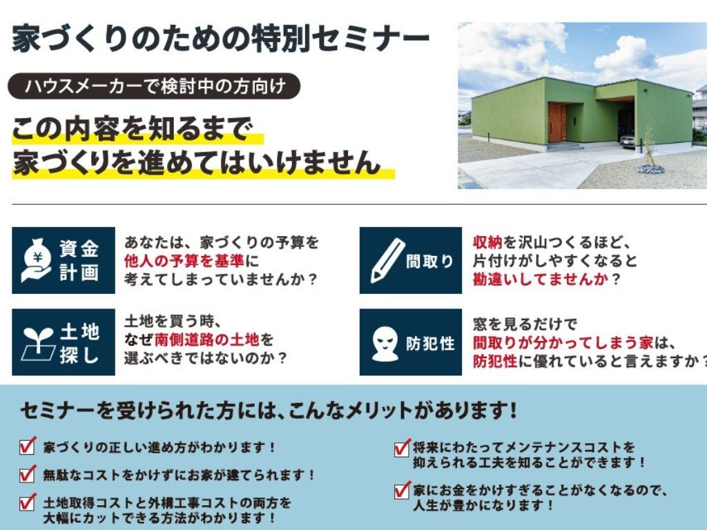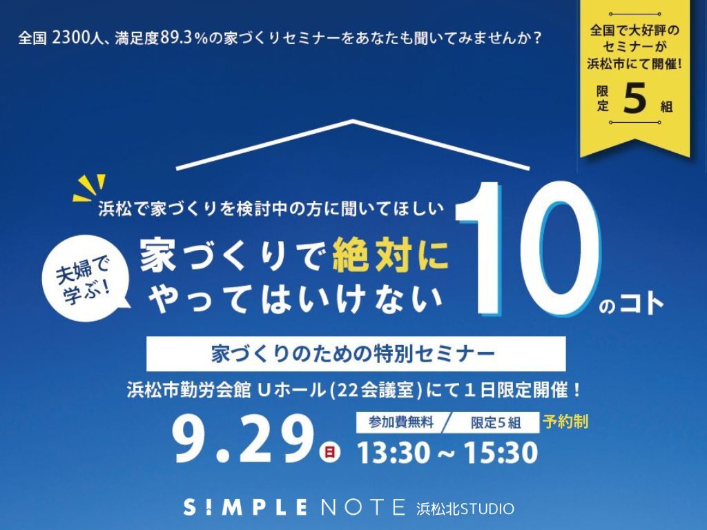 | タイトル | 【浜松市中央区】新築をご検討中の方必見!家づくりのための特別セミナー開催 |