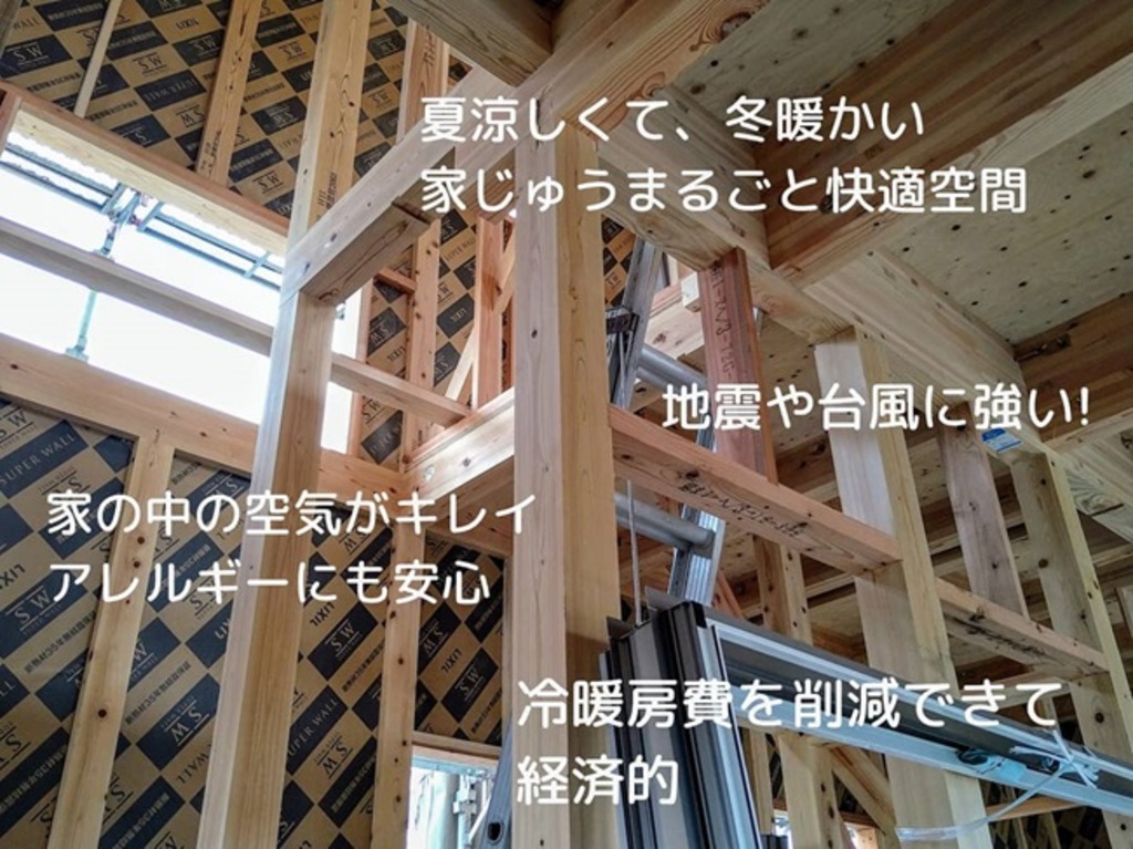 在来工法に高性能SWパネルをはめこんで家全体を包み込んだ、高気密・高断熱・高耐震構造。魔法瓶のように快適温度をキープするから、暑い夏も寒い冬もお家まるごと快適空間。