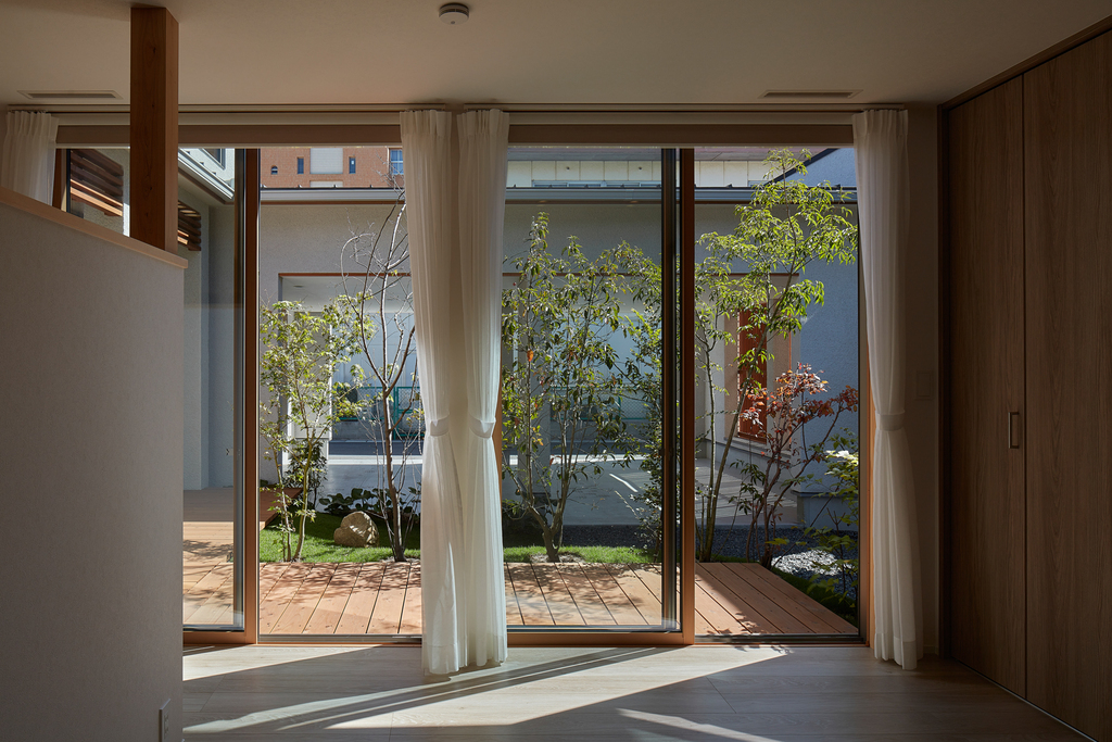 大きな窓からは、季節に応じて変わる中庭の色彩豊かな木々を存分に楽しむことができ、まるで自然と一体化したかのような心地よさを感じられます。