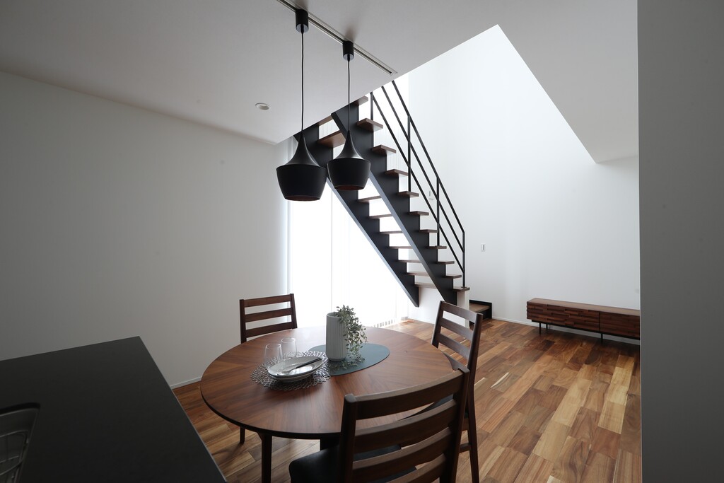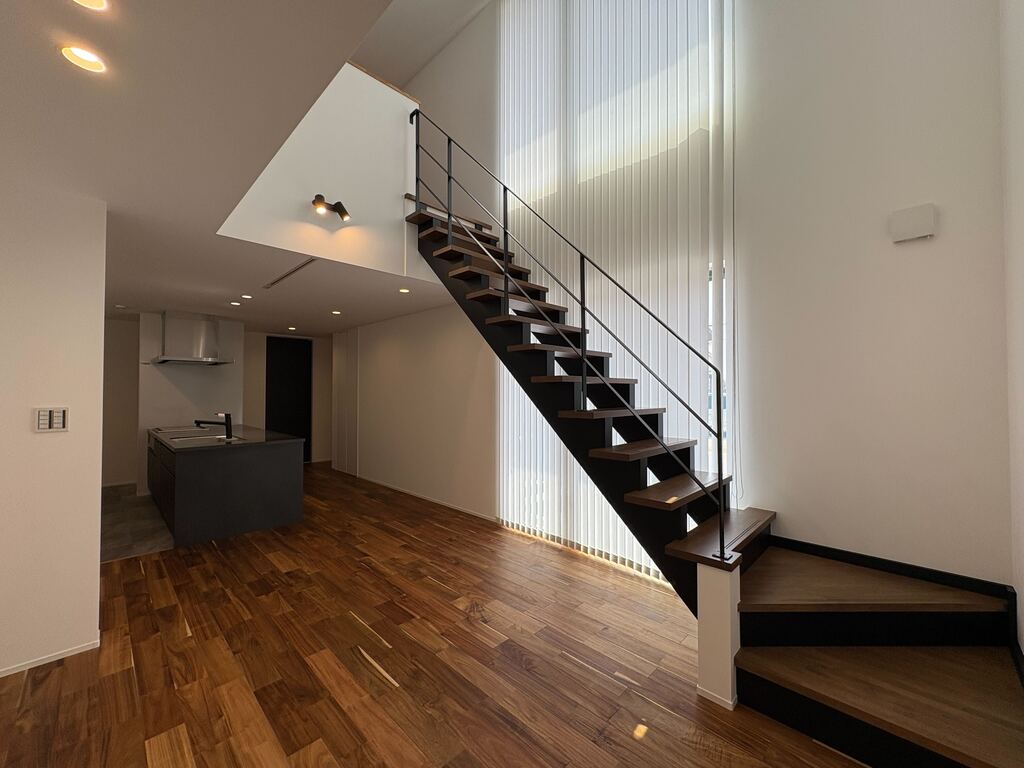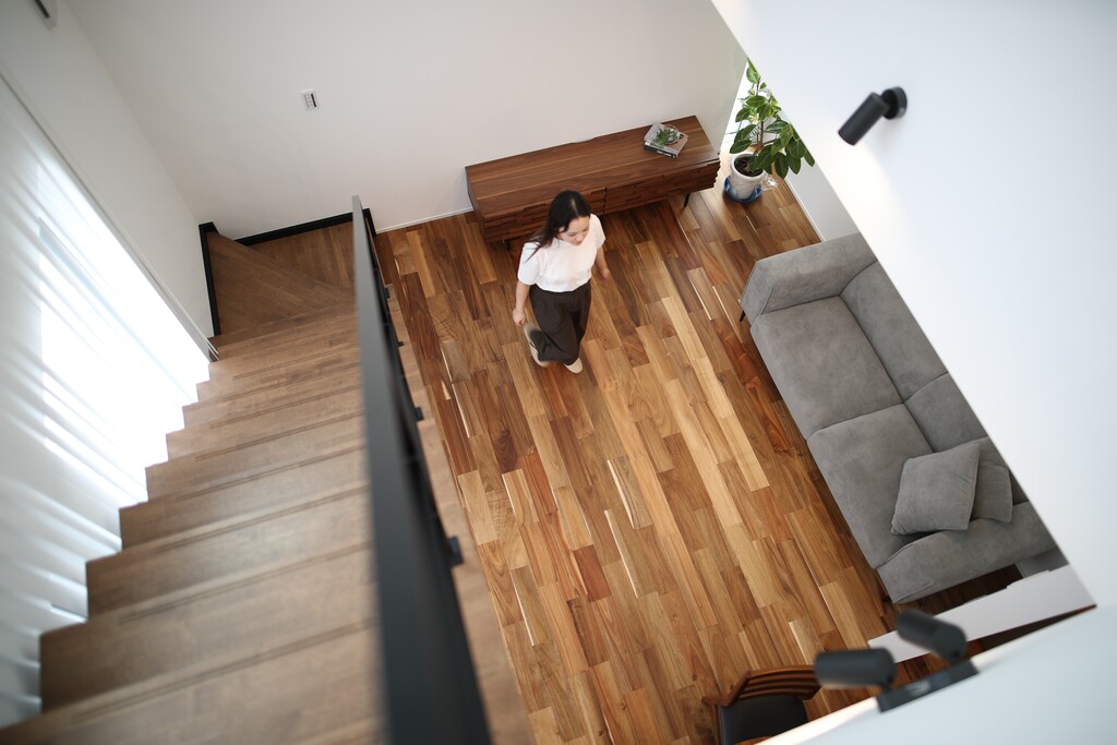 視線を遮らないストリップ階段が空間に抜けを生み、実際の面積以上の広がりを感じられる設計。