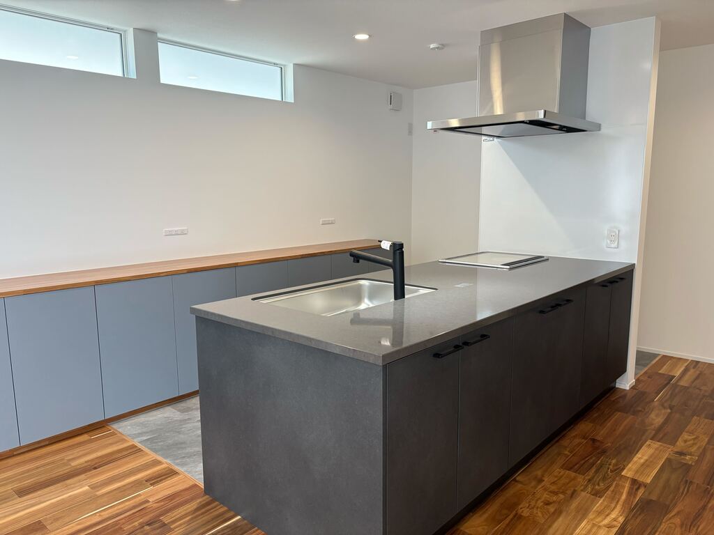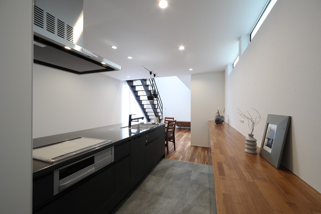 マットな質感のブラックキッチンと、背面のウォールカウンターが美しく調和。