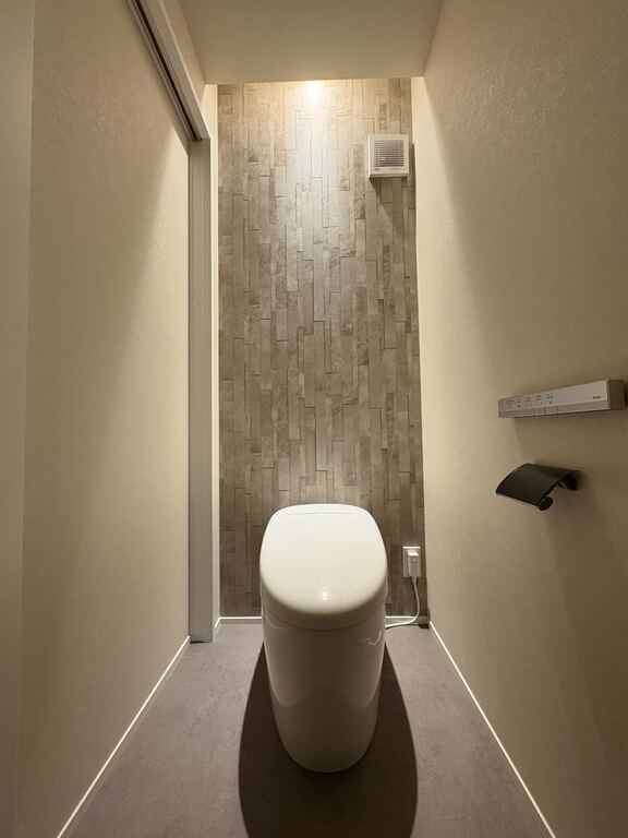 トイレや洗面などの水まわりにも、素材の質感と照明計画にこだわり、