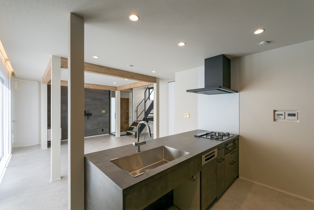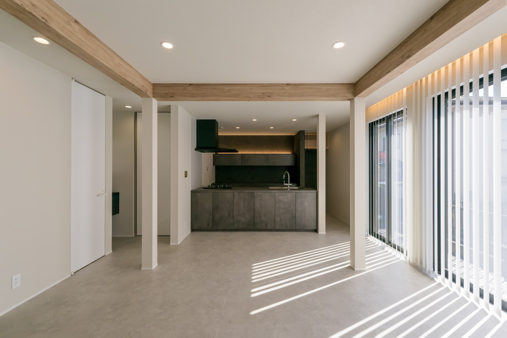 間取りを見直し、キッチンとリビングを一体化することで、開放感のある大空間へと刷新。梁を活かしたデザインと間接照明により、シンプルながらも上質な雰囲気を演出しています。大きな開口部から光が差し込み、家族が自然と集まる明るいリビングに生まれ変わりました。