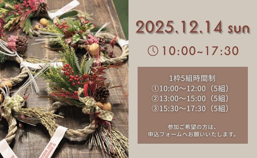 | タイトル | 🎍オリジナルしめ縄づくり Work shop 予約受付開始✨ |