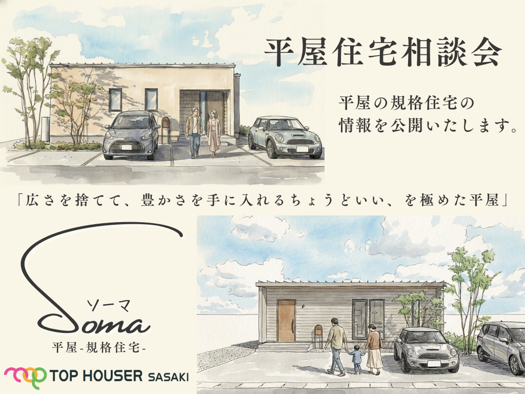 今回、創業45周年を記念して、トップハウザーササキの平屋規格住宅「soma-ソーマ-」を1棟限定で、特別価格でご提供することにいたしました。