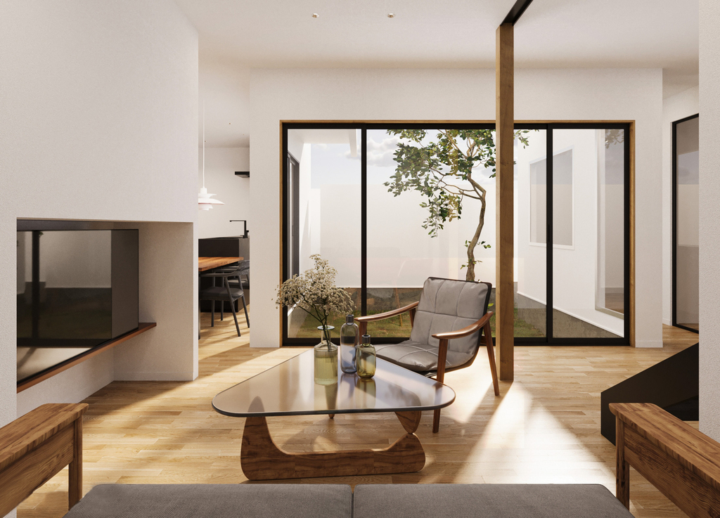 →リビング、キッチン、ホール、和室から眺めることのできる大開口の窓を設けております。コの字型の設計のため、隣家との視線を遮る独立した壁を設けています。家族が集う場所としても最適です。