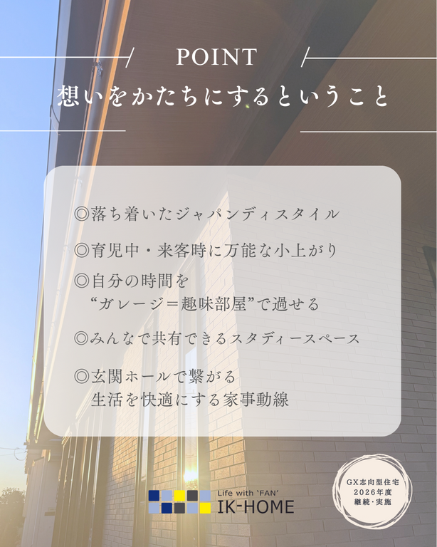 玄関ホールで繋がる生活を快適にする家事動線から、育児中・来客時でも万能な小上がり。リビング全体でお子様の成長を見守り、そしてみんなで共通ができるスタディースペース。
