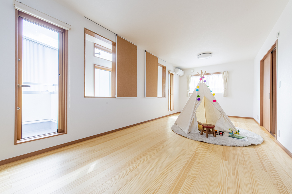 共働きで忙しい方にはランドリースペースとしてウッドデッキのサンルームを設置するのはいかがでしょうか。もちろん、室内物干し金物や造作棚なども◎お子さまそれぞれの寝室が必要な場合は、間仕切りを設けたり、お好みのクロスを選んだり。ワークスペースや趣味の空間として、ウォークインクローゼットを書斎にカスタマイズするのもいいですね!外構のフェンスやカーポート、宅配ボックスなどもご相談ください。