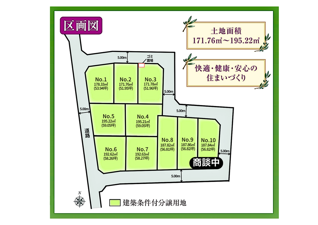 <土地面積> 171.76㎡(51.95坪)~ 195.22㎡(59.05坪)